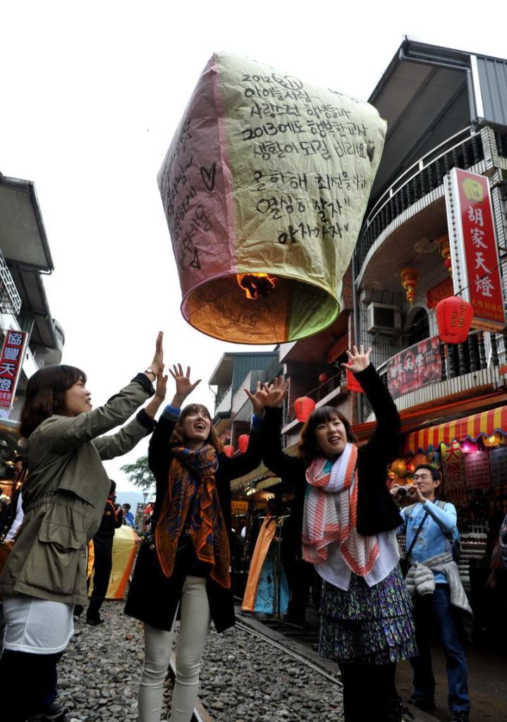 老街上的天燈業者有好多家,多年下來這些店家服務客戶早已形成了一套SOP:從挑天燈、寫心願到施放、拍照都不用遊客費心,只要跟著引導做。服務人員不僅幫忙施放,也幫忙拍照:一個口令擺一個手勢,中、英、日、韓等等多國語言同時伺候,讓外國的朋友們也能順利而盡興地許下願望,留下出遊的珍貴記憶。
